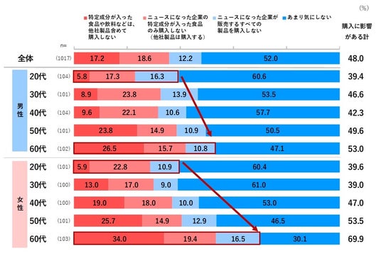 全体では、「あまり気にしない」、「購入に影響する」との回答が約半数ずつ。男女とも、20代の「購入に影響する」との回答が4割とそれぞれの性別で最も低く、年代があがるにつれて増えていき、60代が女性69.9%(全体より+21.9pts)、男性53.0%(+5.0pts)と最も高くなっている。年代があがるほど、健康被害に関するニュースが購買行動に影響を及ぼしている。