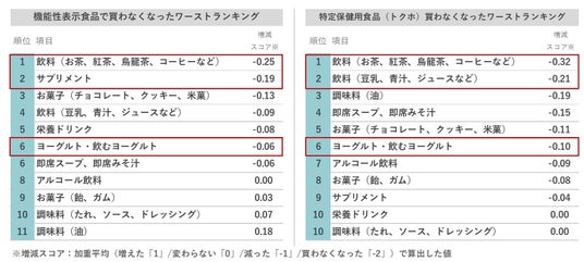 ワーストランキング2位は、「機能性表示食品」では「サプリメント」、「トクホ」では「飲料(豆乳、青汁、ジュースなど)」でした。いずれも前問にて購入経験が上位3位までに挙がったカテゴリーであり、購入量の変化は購入経験の高さと比例しています。一方で、前問にて「機能性表示食品」「トクホ」とも2位となっていた「ヨーグルト・飲むヨーグルト」は、11カテゴリー中「機能性表示食品」「トクホ」とも6位と大きな変化は受けていませんでした。
