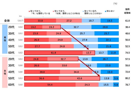 ジェネリック医薬品の服用経験有は全体で61.0%。男女とも20代の服用経験がそれぞれの性別で最も低く、年代があがるにつれて増えており、男性では60代が74.5%(全体より+13.5pts)、女性では50代が80.2%(+19.2pts)と最も高くなっている。