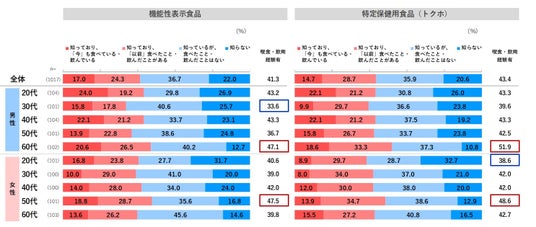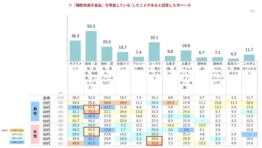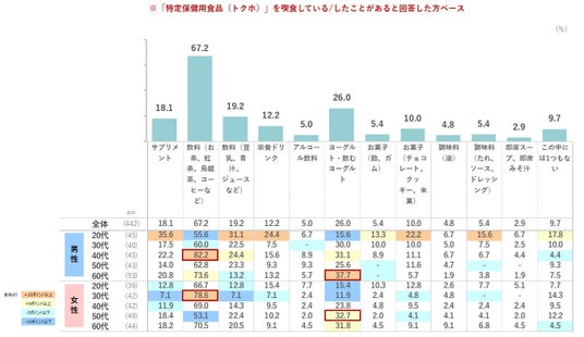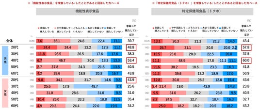 「機能性表示食品」では男性40代53.4%(全体より+13.7pts)、男性20代48.8%(+9.1pts)、 「トクホ」では男性40代60.0%(+16.6pts)、男性20代57.8%(+14.4pts)でした。女性では、20代の「機能性表示食品」が43.9%(+4.2pts)と女性の中では多い方ですが、20代を除いて、「トクホ」も含めて数値が全体値より下回っています。