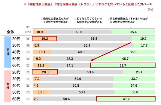 「どちらも同じくらいの有効性や安全性がある」との回答が53.6%と最も多い。国の認可が必要となる「トクホ」の方が高いとの回答は全体で35.4%だが、男女とも60代の5割が「トクホの方が高い」と回答。