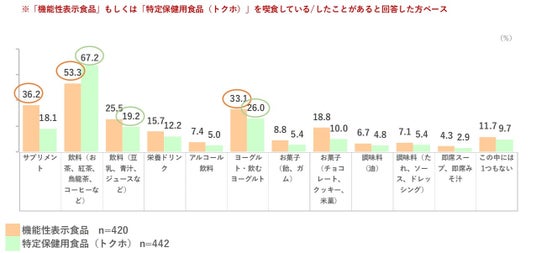 「機能性表示食品」「トクホ」とも「飲料(お茶、紅茶、烏龍茶、コーヒーなど)」での購入経験が最も多く5割を超える。「機能性表示食品」の次点は、「サプリメント」36.2%、「ヨーグルト・飲むヨーグルト」33.1%、「トクホ」では「ヨーグルト・飲むヨーグルト」26.0%、「飲料(豆乳、青汁、ジュースなど)」19.2%と続く。各カテゴリーにて、 「機能性表示食品」「トクホ」の購入経験はおおよそ同程度だが、「機能性表示食品」では「サプリメント」、 「トクホ」では「飲料(お茶、紅茶、烏龍茶、コーヒーなど)」での経験値が高く出ている。