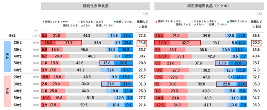 「信頼している」との回答は「機能性表示食品」27.3%、「トクホ」36.6%と、国の認可が必要な「トクホ」の方が9.3pts高い。前問の「購入意向の影響」に続き、男性20代が「機能性表示食品」44.2%(全体より+16.9pts)、「トクホ」50%(+13.4pts)と全性年代で最も信頼度が高い。