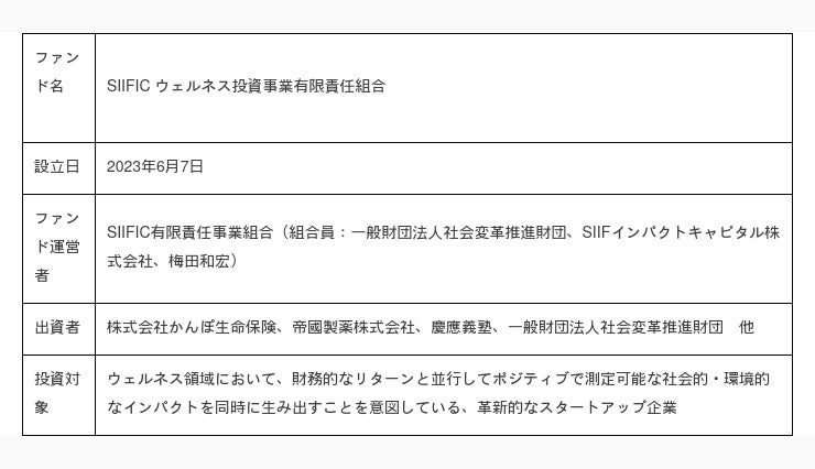 そこでこの度、SIIFは、これまで蓄積してきた知見に基づき、ウェルネス領域のシステムチェンジを目指すインパクト投資・IMMを実践し、その実例や知見を公開・発信、人材を育成・輩出することを目的に、SIIFICを設立しました。そして、SIIF・SIIFIC及びファンドマネージャーから構成されるSIIFIC有限責任事業組合(以下、「SIIFIC LLP」)を運営者として、本ファンドを組成し、ファースト・クロージングを完了いたしました。今後は、投資活動を開始しながら、2024年末のファイナル・クローズを目指して引き続き資金募集を継続して参ります。