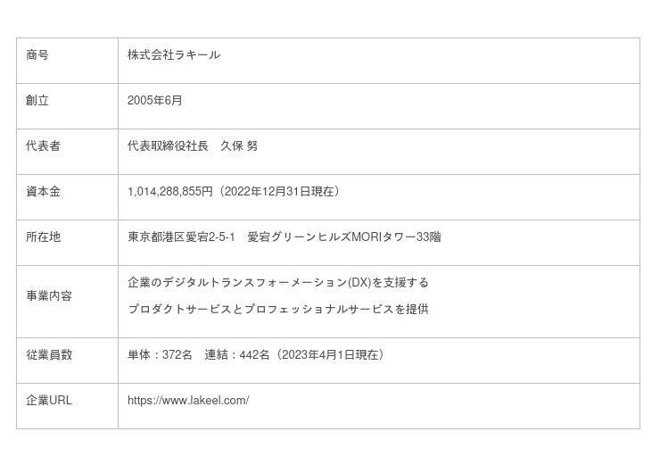 2005年6月10日創立。2012年8月より独自のプロダクトブランドLaKeel(ラキール)シリーズの提供を開始。クラウド型アプリケーション開発運用基盤「LaKeel DX」を中心に、先進的なアーキテクチャと深い業務理解を基に構築された13種類のプロダクトを展開しています。2021年7月東京証券取引所マザーズ(現グロース)市場に上場。ビジネスのコアに変革をもたらすプロダクトを提供し続け、企業のデジタルトランスフォーメーション(DX)を支援しています。