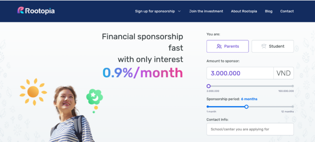 教育ローンの支払いを迅速かつ直感的、透明性をもって支援します。正しい目的を持った学生に適切に資金が援助・投資されるように、デューデリジェンスを厳格に実施した上でマッチングを実現します。Rootopiaのプラットフォームでは、学生と保護者は、専門的なチームによって、迅速かつ効率的に教育ローン調達の登録を完了することができます。これは、現在の市場で最も安全で親切なソリューションと考えることができますし、月0.9%と金利も手頃な価格に設定されています。教育ローンを受けた後は、保護者が月単位で分割してそれを返済することで、家庭のキャッシュフローの負担を軽減することに貢献します。
