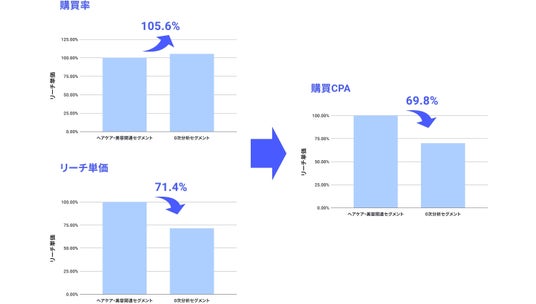 一般的に親和性の高そうな「ヘアケア・サロン・美容」に興味関心があるセグメントDに比べ、『最適セグメント分析』によるセグメントCの方が、購買率が5.6%高く、リーチ単価も28.6%抑えることができました。また、今回の施策の重要KPIであった「購買CPA」は、30.2%抑えることに成功しました。