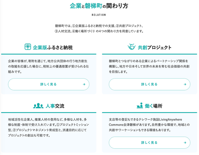 福島県磐梯町(ばんだいまち/町長:佐藤淳一、以下磐梯町)は、2023年6月28日に「企業版ふるさと納税」や「共創プロジェクト」など企業とまちとの関わり方を紹介する特設WEBサイトを公開しました。本サイトでは、企業の方に向けて、企業版ふるさと納税の活用方法や、共創・連携の事例などを紹介します。また、多様なセクターとの橋渡しをサポートするコーディネーターへ、気軽に問い合わせすることも可能です。そのほか、企業人材の受入等も行なっており、企業のニーズに合わせた連携・共創について具体的にイメージできるサイトです。