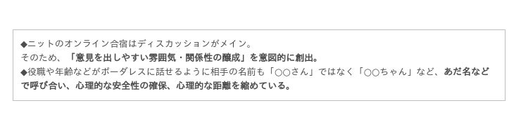 参照)今年6月の合宿:ニット流!テーマ達成度90%超え、オンライン合宿の作り方と運営方法