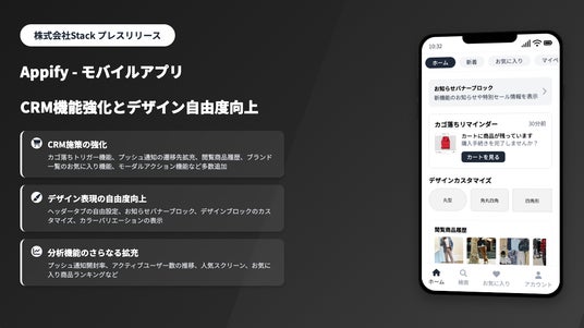 株式会社Stack(本社:東京都渋谷区、代表取締役CEO:福田涼介、以下「Stack」)は、Shopifyストア向けモバイルアプリ構築サービス「Appify - モバイルアプリ」において、顧客体験の向上とデザイン表現の自由度を高める新機能を多数追加し、大幅な機能アップデートを段階的に実施いたします。