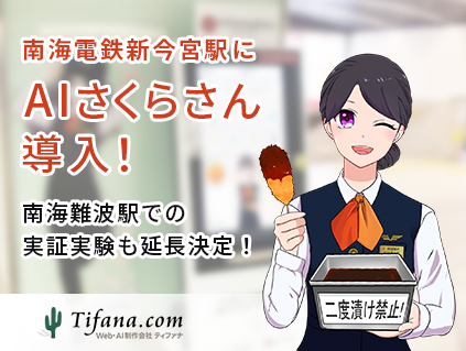 株式会社ティファナ・ドットコム(本社:東京都目黒区、代表取締役社長:藤井 亮、以下ティファナ・ドットコム)は、南海電気鉄道株式会社(以下南海電鉄)の難波駅で実施している人工知能(AI)接客システム「AIさくらさん」による実証実験を、2022年4月以降も延長すると同時に、本実験2駅目となる南海「新今宮駅」での実証実験を2022年4月22日より開始します。今回より、串カツを手に持ったAIさくらさんが、トイレの空き情報配信やクイズゲームといった新たな取り組みを加えて鉄道利用者への案内業務を担当します。