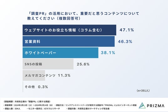 調査PRの活用に関しては、「ウェブサイトのお役立ち情報」や「営業資料」、「ホワイトペーパー」が重要なコンテンツとして挙げられています。これらのコンテンツが様々な形で価値を提供し、企業の認知度向上やブランド構築、リード生成に貢献していることが伺えます。