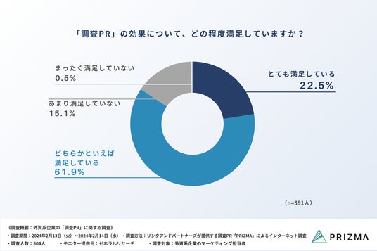 「Q10:「調査PR」の効果について、どの程度満足していますか?」では、「とても満足している」が22.5%、「どちらかといえば満足している」が61.9%、「あまり満足していない」が15.1%、「まったく満足していない」が0.5%という回答になりました。