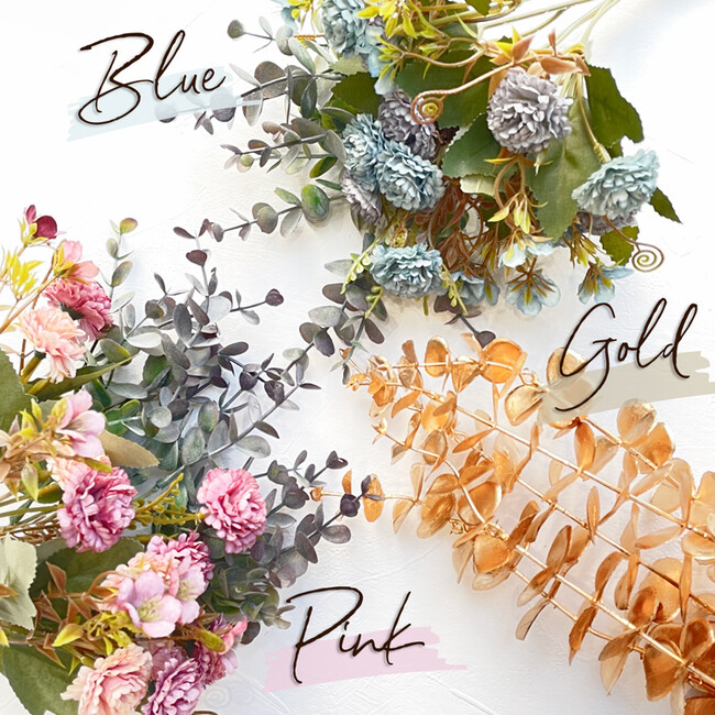 結婚式場の雰囲気や、テーマカラーに合わせて、ブルー、ピンク、ゴールドの3色からお好きな造花が選べます。