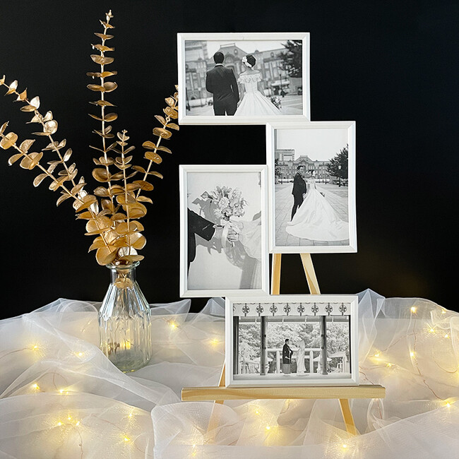 前撮りや、想い出の写真を飾るだけでお2人らしい空間に早変わりします。専用の木製イーゼルも付いているので、準備を忘れていたということが無く安心です。