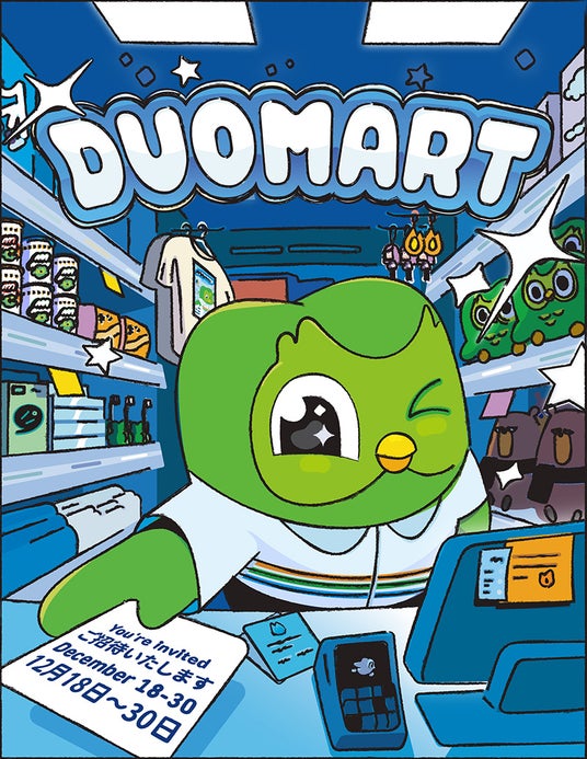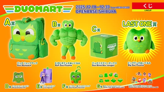 Duolingo, Inc.(本社所在地:Pittsburgh, USA、以下「Duolingo」)は、日本初となる期間限定ポップアップストア「DUOMART」で取り扱う販売商品一覧を発表いたしました。本イベントは2025年12月18日(木)~12月30日(火)、東京・OPENBASE SHIBUYAにて開催されます。