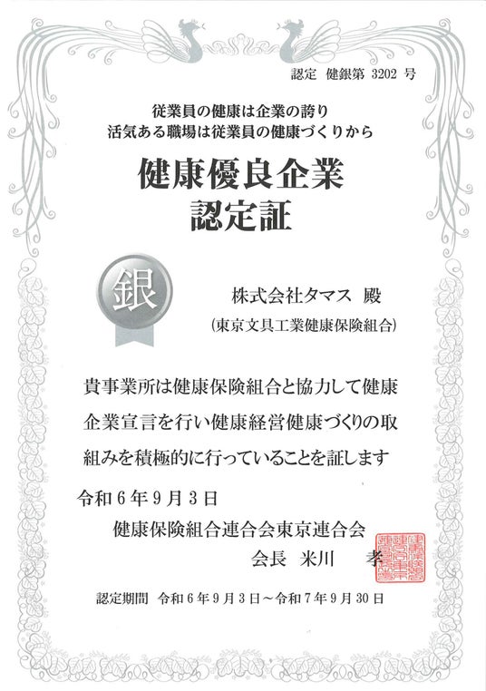 「バタフライ」ブランドを展開する株式会社タマスは、2024年9月3日、健康保険組合連合会 東京連合会より、健康優良企業「銀の認定」を取得しました。