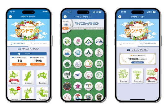 また、「スコア丸」に先行して2024年4月17日より「ラウンドマーカー機能」が導入されており、PGMのゴルフ場でラウンドするとゴルフ場のロゴマーク入り「ラウンドマーカー」や、各種サービス利用で「スペシャルマーカー」を獲得し、アプリ上でコレクションできます。獲得マーカー数・ラウンド数の全国ランキングや、エリア内ゴルフ場のラウンドマーカーを全て獲得すると「COMPLETE(コンプリート)」マークが表示されるコレクション意欲をそそる機能です。