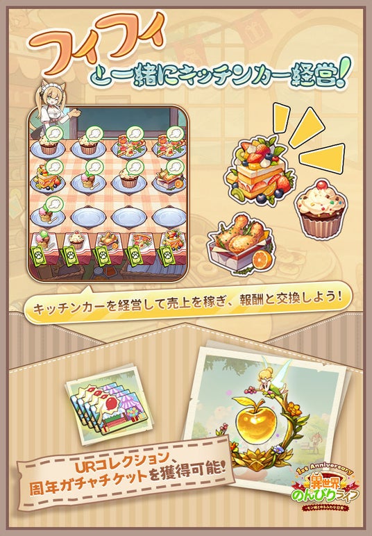 1周年記念イベント「ケモミミ村大感謝祭」も開催中!限定UR☆キャラクター「奈々子」や新着せ替えガチャ、新しいキッチンカーの経営コンテンツなど、盛りだくさんの内容で周年を盛大にお祝いします。