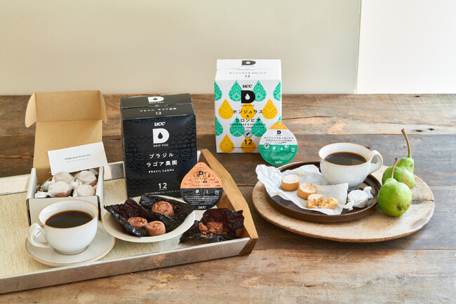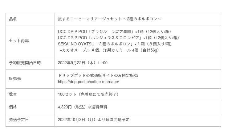UCC上島珈琲株式会社(本社/兵庫県神戸市、資本金/10億円、社長/朝田文彦、以下UCC)は、コーヒー豆本来の特徴を引き出した「最高の一杯」を、いつでもボタンひとつで味わえるカプセル式ドリップコーヒーシステム「ドリップポッド」より、コーヒーとお菓子の味わいを楽しめる「旅するコーヒーマリアージュ」セット第3回を9月22日(木)より100セット限定で予約販売を開始します。ドリップポッド専用コーヒーカプセルはブラジル産のスペシャルティコーヒー「ブラジル ラゴア農園」と、9月1日(木)より発売を開始した新製品「ホンジュラス&コロンビア」をご用意しました。お菓子は「SEKAI NO OYATSU」が作る「2種のポルボロン」です。