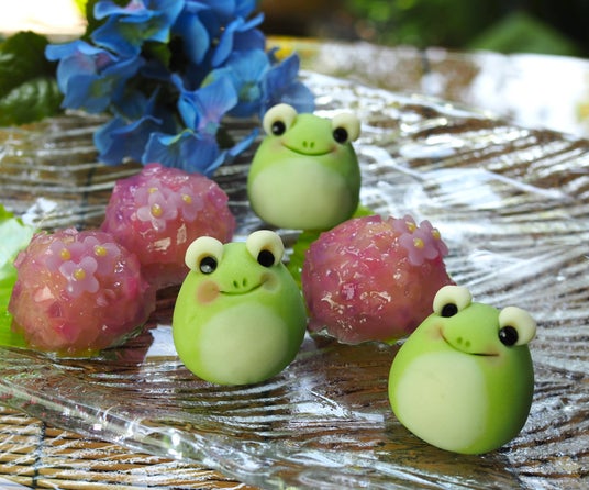 梅雨の時期にピッタリな可愛らしい「紫陽花」「カエル」を上生菓子にしました。
