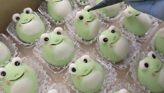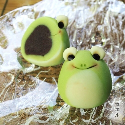 こし餡を黄緑に色付けした練切りあんで包みお腹には白色にぼかし入れた梅雨にぴったりなぽっちゃりフォルムの可愛いカエル。クリクリな目にピンク頬っぺたでより可愛い表情にしました。