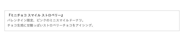『ミニチョコ スマイル ストロベリー』は、バレンタインシーズン仕様のピンク色をしたスマイルドーナツです。風味豊かなチョコ生地と甘酸っぱいストロベリーチョコが溶け合う、華やかな味わいをお楽しみいただけます。