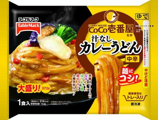 CoCo壱番屋監修汁なしカレーうどん 大盛り「カレーハウスCoCo壱番屋」監修の本格カレーソースとテーブルマーク自慢のうどんのコラボ!ココイチで人気トッピングのチーズ・ナス・ほうれん草(彩りで赤ピーマン)を使用。トレー付&大盛りだから簡単便利で大満足な一品です!