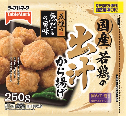 国産若鶏の出汁から揚げ 250g国産若鶏のむね肉に、こだわりの出汁をきかせた和風から揚げです。5種の出汁(さば、いわし、そうだかつお、むろあじ、あご)を使用した特製だれに漬け込み、出汁感を感じつつもシンプルな