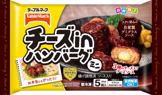 チーズinハンバーグ(ミニ)3種類のチーズ入りチーズソースを国産若鶏を使用した肉で包み込み、ふっくらジューシーに焼き上げました。じっくりと煮込んだ自家製デミグラスソースとも絡み合い、小さくても本格的な味に仕上げています。