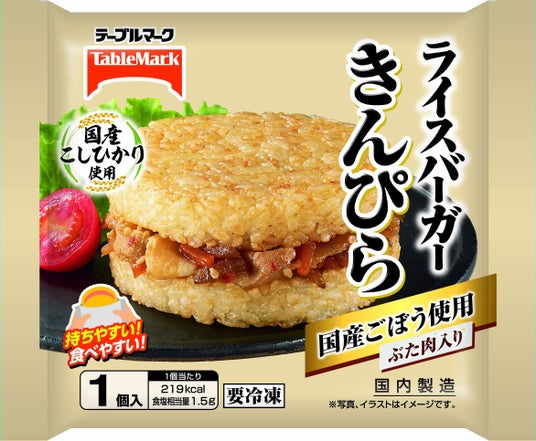 ライスバーカー きんぴら国産ごぼう、国産にんじんで作ったきんぴらと豚肉をライスバンズでサンドした和風のライスバーガー。国産ごぼうのシャキシャキ食感がアクセントになっています。ライスバンズはお米のおいしさにこだわり、国産こしひかり使用。しょうゆ、みりん等で味付けたライスバンズを、オーブンでこんがり焼き上げ、表面はカリっと、中はふっくらと仕上げました。