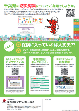 損害保険ジャパン株式会社(代表取締役社長:西澤 敬二、以下「損保ジャパン」)は、千葉県との「千葉県の地域防災力向上に関する包括連携協定」に基づいて千葉県の地域貢献取組みの一環として、防災パンフレット『ちばまるごと安心ガイド』を作成しました。