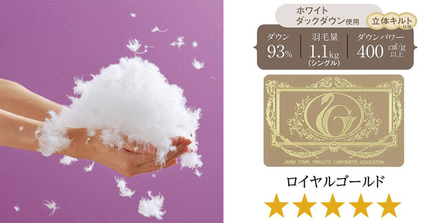 日本羽毛製品協同組合の品質基準に合格した羽毛原料は、確かな品質のロイヤルゴールドラベル付きです。