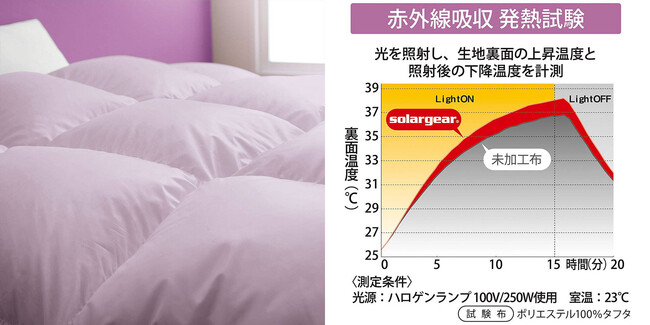 熱変換効率の高い合成セラミックを使用した赤外線吸収加工生地「solargear (ソーラーギア)(R)」採用し、発熱生地と羽毛でダブルの暖かさを実現。