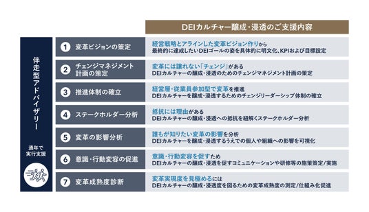 「カルチャー変革支援サービス」は、変化の激しい市場環境において持続的な成長を目指す企業のDEIカルチャーの醸成・浸透に向けた取り組みをEnd to Endで支援するサービスです。DEIや組織的変革管理、テクノロジーに精通したコンサルタントが、従業員の潜在能力を最大限に引き出し提供価値につなげるご支援を行うことで、企業価値向上の実現に寄与します。