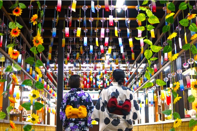 正面玄関を抜けるとすぐ!風鈴とひまわりのフラワーカーテンがお客様をお出迎え。色とりどりの風鈴がずらりと並んだ壮観な風景は目にも涼しく、夏を感じさせられるフォトスポットになっております。