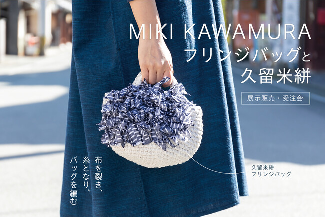 今回の企画展では、お客さまご自身に生地をお選びいただき、久留米絣をより身近に感じていただくとともに、裂き編み作家の河村さんとのコラボレーションとして、MIKI KAWAMURAの裂き編みバッグにフリンジとして編み込むことで、新たな久留米絣の活かし方に挑戦していきます。