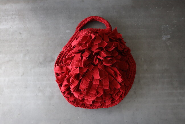 ひとつひとつに思いこめて河村さんが作られる「MIKI KAWAMURAの裂き編みバッグ」は、手で布を裂き糸を作るところからはじまる手編みのバッグ。象徴的な「フリンジ」部分は、ときに満開の「花」のようにも見えたり、ときにふわふわの「鳥の羽」のようにも見えたり。持つときどきで、くるくると巧みに表情を変えて、持つ人の個性にそっと寄り添ってくれるような、魅力的なバッグです。