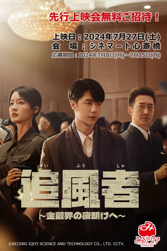 お客様のご要望に応え、大阪にて先行上映会に100名様無料ご招待。本日より参加応募受付を開始します。「みるアジア」ベーシック会員様向け限定イベントとして「追風者:1話&2話+特別映像」を上映します。