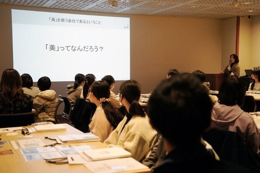 「美を紡ぐ」ロゴ 「美を紡ぐ」は2018年から実施している当社グループ横断プログラムで、一人ひとりの美意識や感受性を磨く活動として、京都の西陣織の老舗、株式会社細尾の細尾真孝氏による監修のもと、日本の伝統工芸から世界各国のトレンド事例・思想に至るまで美に関するさまざまな情報を蒐集し、理解を深めてきました。また、集めた“美”に関する世界中の事例をもとに各自の視点を持ち寄りディスカッションすることで、当社グループが創出すべき「美」の指針を体系化しています。