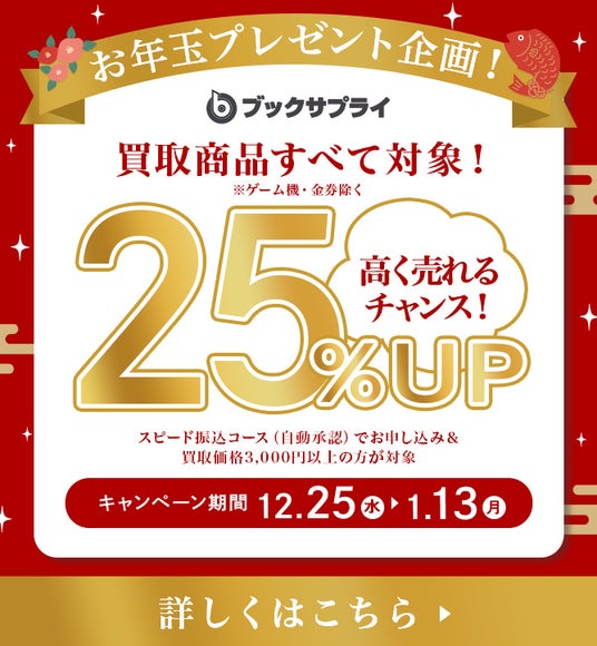 株式会社ブックサプライ(本社:大阪府吹田市、代表取締役:藪田真吾)は、「お年玉プレゼント企画」として、特別な買取キャンペーンを期間限定で開催いたします。本キャンペーンは、2024年12月25日(水)から2025年1月13日(月)まで実施され、買取対象全アイテムの買取金額が通常より25%UPいたします。本・CD・DVD・ブルーレイ・ゲームソフトなどを、よりお得に売却できるこの特別な機会をぜひご利用ください。