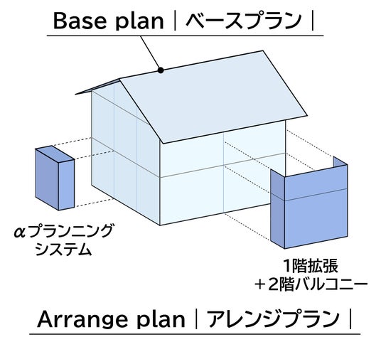 郊外エリアの一次取得者ニーズに合わせたコストパフォーマンスを実現するため、矩形総二階の建物シルエットとシンプルな切妻屋根に限定したペースプランを設定。このベースプランに対して、お客様の要望や敷地条件に合わせて「αプランニングシステム」やバルコニーを追加しプランをアレンジすることができます。「αプランニングシステム」は、居住空間や玄関、サニタリーなどの機能空間をユニット躯体に付帯できるサブシステムです。これによりプラン対応力と価格対応力を両立します。