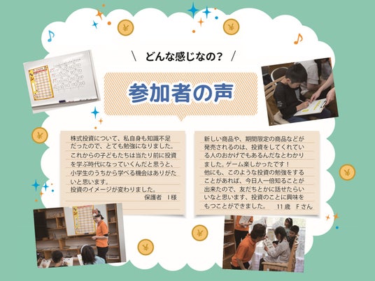 対象年齢は8~12歳のお子様。一緒にご参加いただく保護者様向けに、子供たちが“投資ゲーム”を楽しむ間に投資の仕組みやお金の知識を学べる「大人のためのマネースクール」を同時開催します。