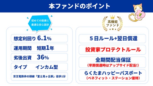『らくたま』は、不動産クラウドファンディングをもっと楽しく、身近に感じていただくために誕生したサービスです。「投資=難しい・堅い」というイメージを払拭し、どなたでも気軽に始められる“最高に楽しい投資体験”を提供しています。