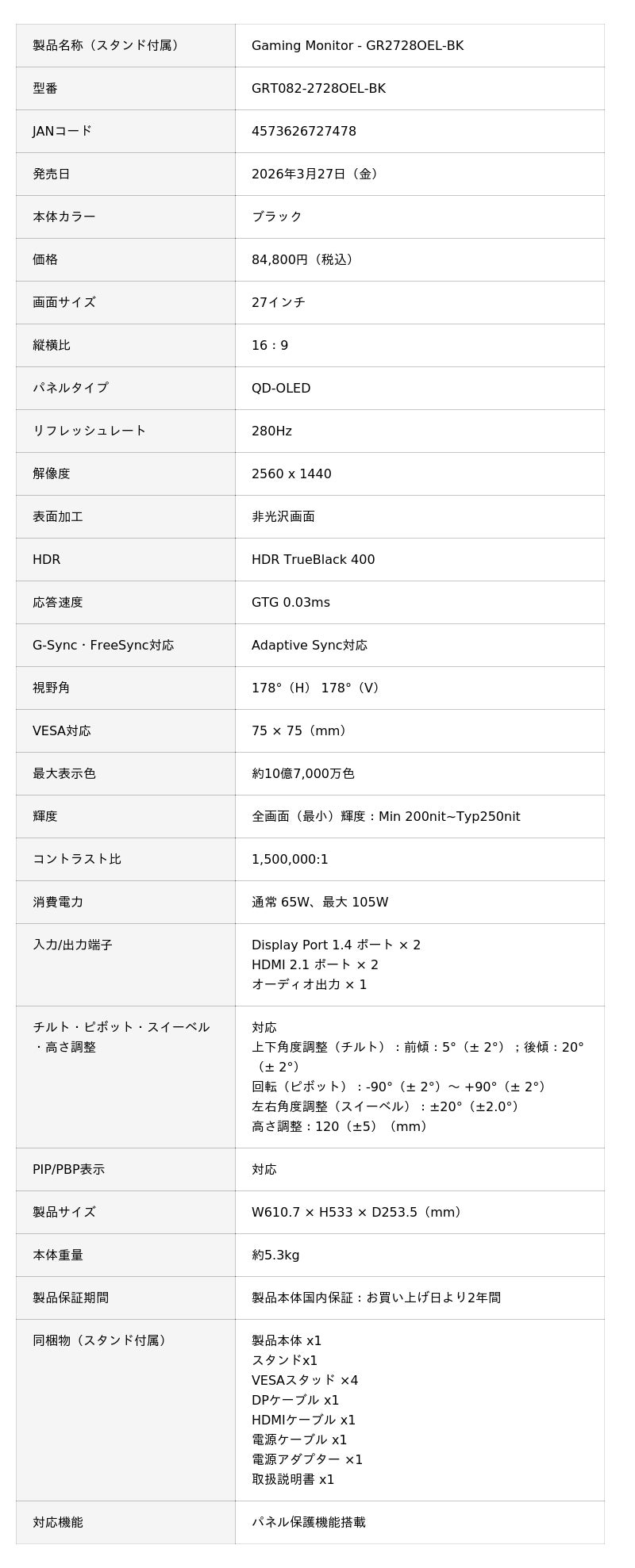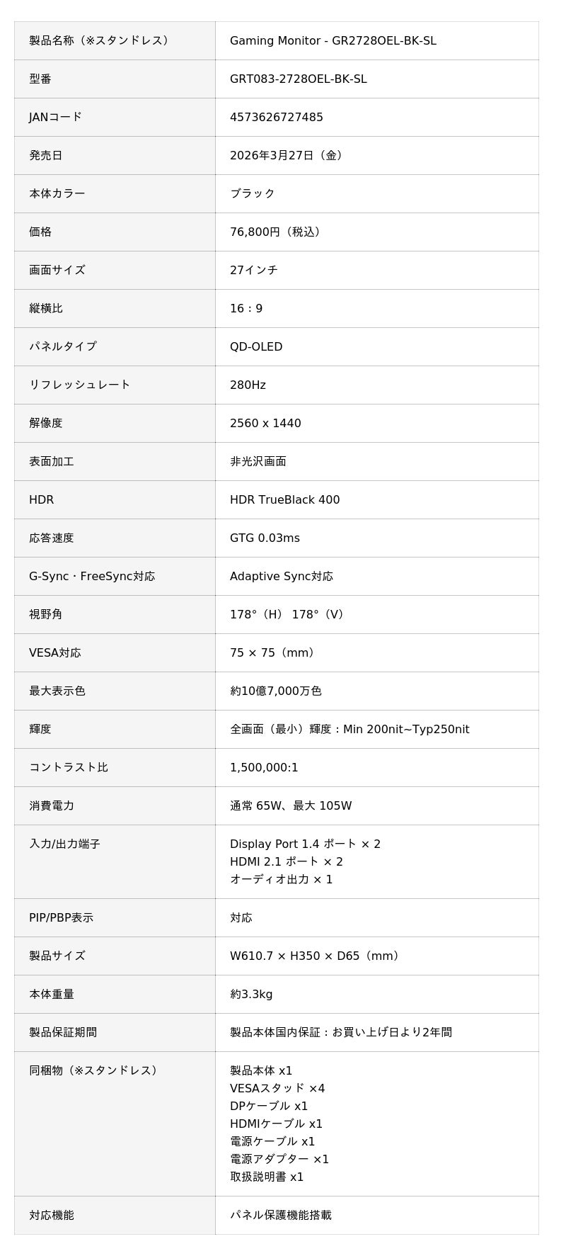 この度、毎日の当たり前をアップデートする『GRAPHT STANDARD』シリーズより、QD-OLEDパネル搭載ゲーミングモニター『GR2728OEL-BK』を2026年3月27日(金)にGRAPHT公式ECサイト(GRAPHT OFFICIAL STORE)およびAmazonにて発売いたします。