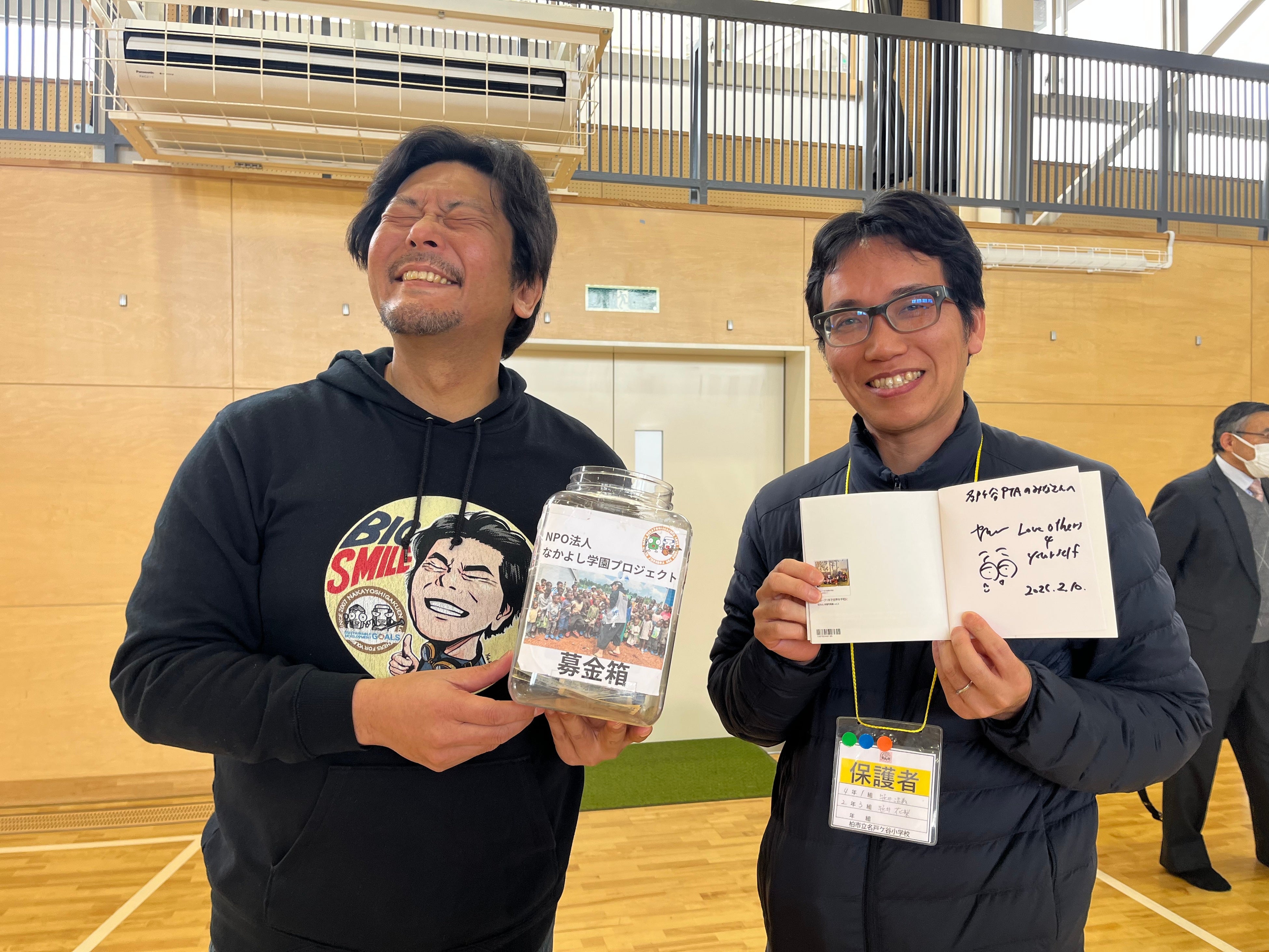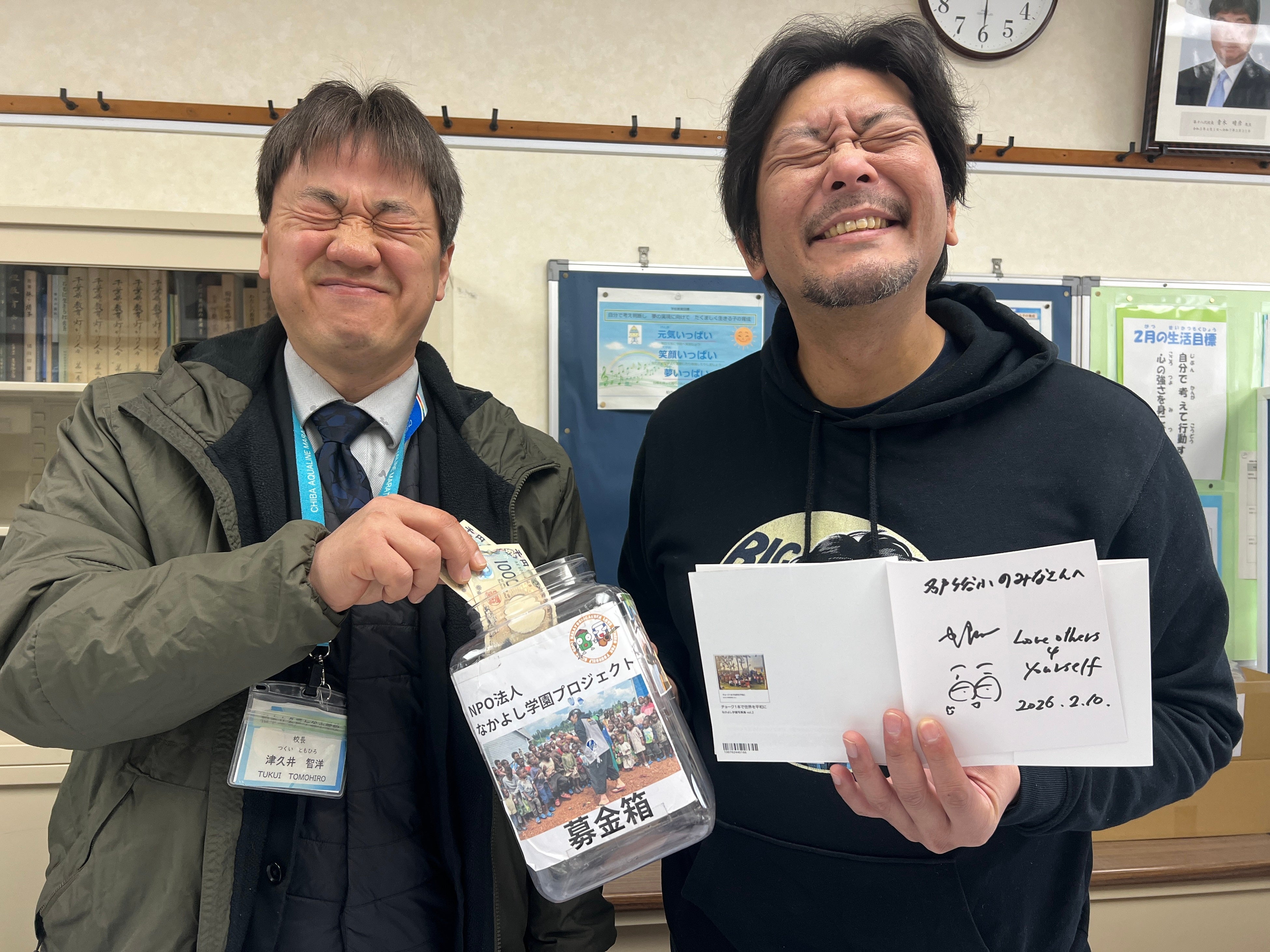 BIG SMILE(最高の笑顔で世界を平和に)で募金に協力してくれた名戸ヶ谷小学校津久井校長
