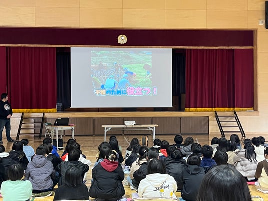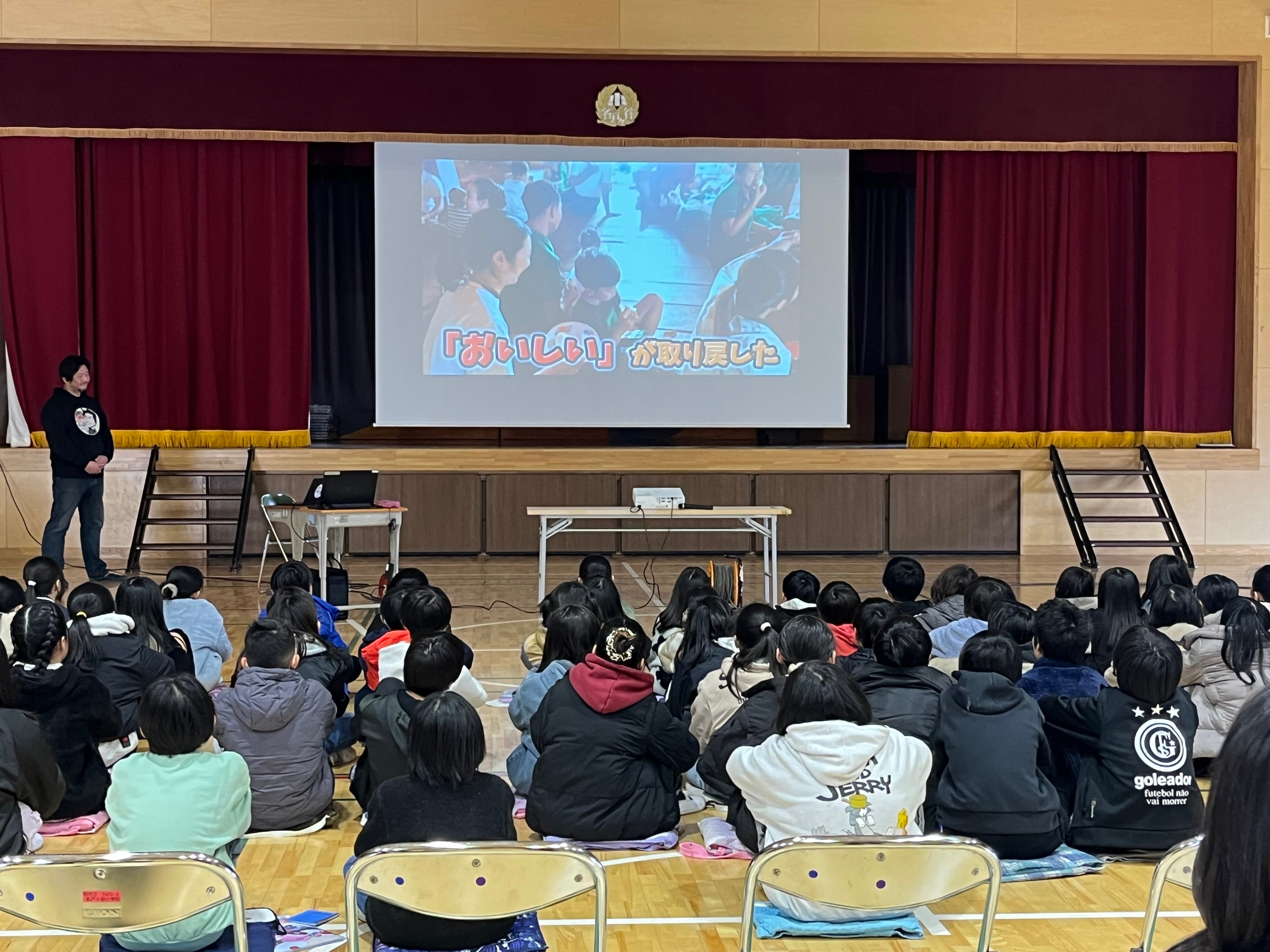 講演会では、現地の炊き出しの様子や、厳しい避難生活の中で食事を受け取る人々の姿が映像・報告として共有されました。子どもたちは、単に「寄付をした」「送った」という出来事としてではなく、自分たちが育てたお米が、海の向こうの“今日”を支えたという事実を、具体的な手触りをもって受け止め直しました。
