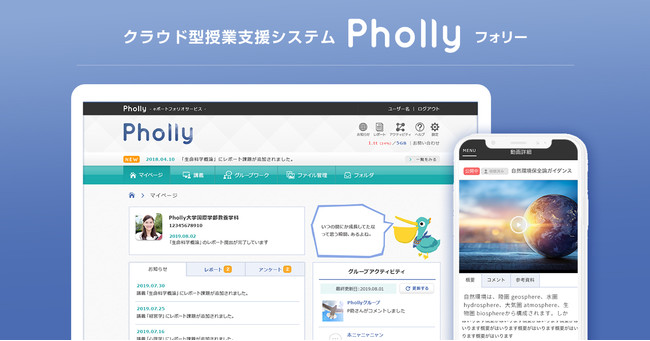 Pholly(フォリー)は「どんな人でも、いつでも、どこでも、どんな端末でも、利用できる」 をコンセプトに、授業前のお知らせや資料の配布、授業後のレポート課題やアンケート回収など、教員と学生の間のコミュニケーションを円滑にすることを目的としたクラウド型の授業支援システムです。 学生は全てスマートフォンやタブレットのアプリ(iOS、Android)からアクセスができます。