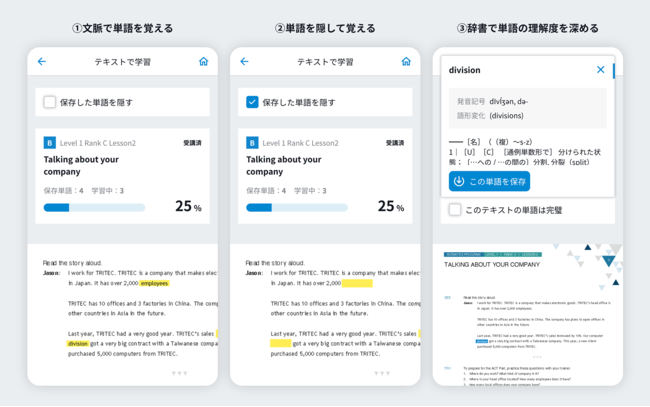 ビジネス英単語を違和感なく使いこなすためには、実際のシーンに近い文脈やフレーズと共に単語を覚えることが重要です。保存した単語はテキスト上でハイライトされるため、覚えるべき単語とその文脈が一目でわかります。単語を非表示にする機能を利用することで、テキストの文脈と一緒に単語を覚えることができます。文脈での単語の使い方を覚えたら、他の意味や使い方を辞書機能で確認し、さらに理解を深めていきます。