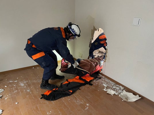 壁に穴を開けて室内から担架で人を運び出す様子
